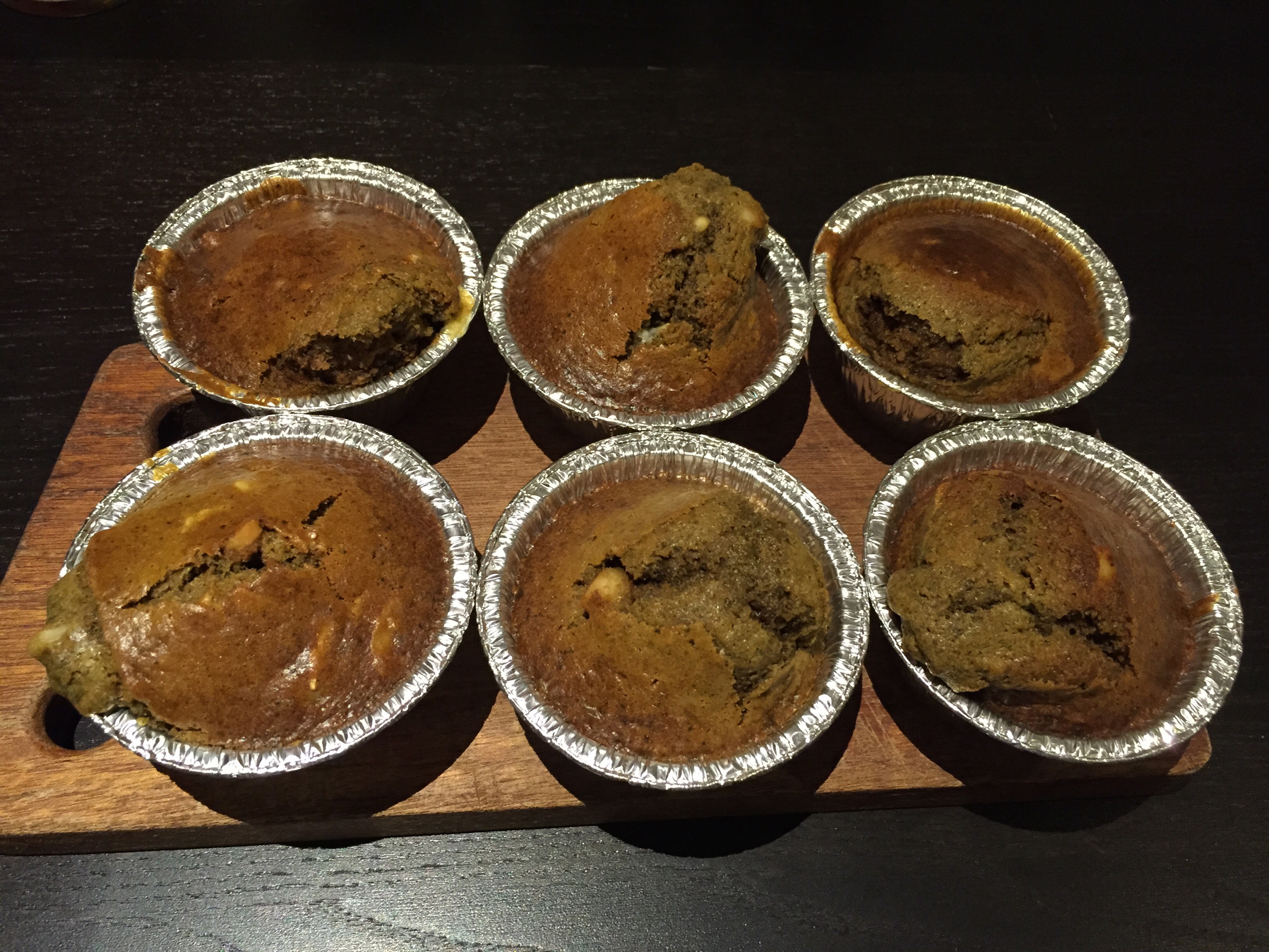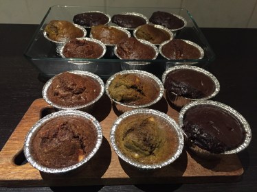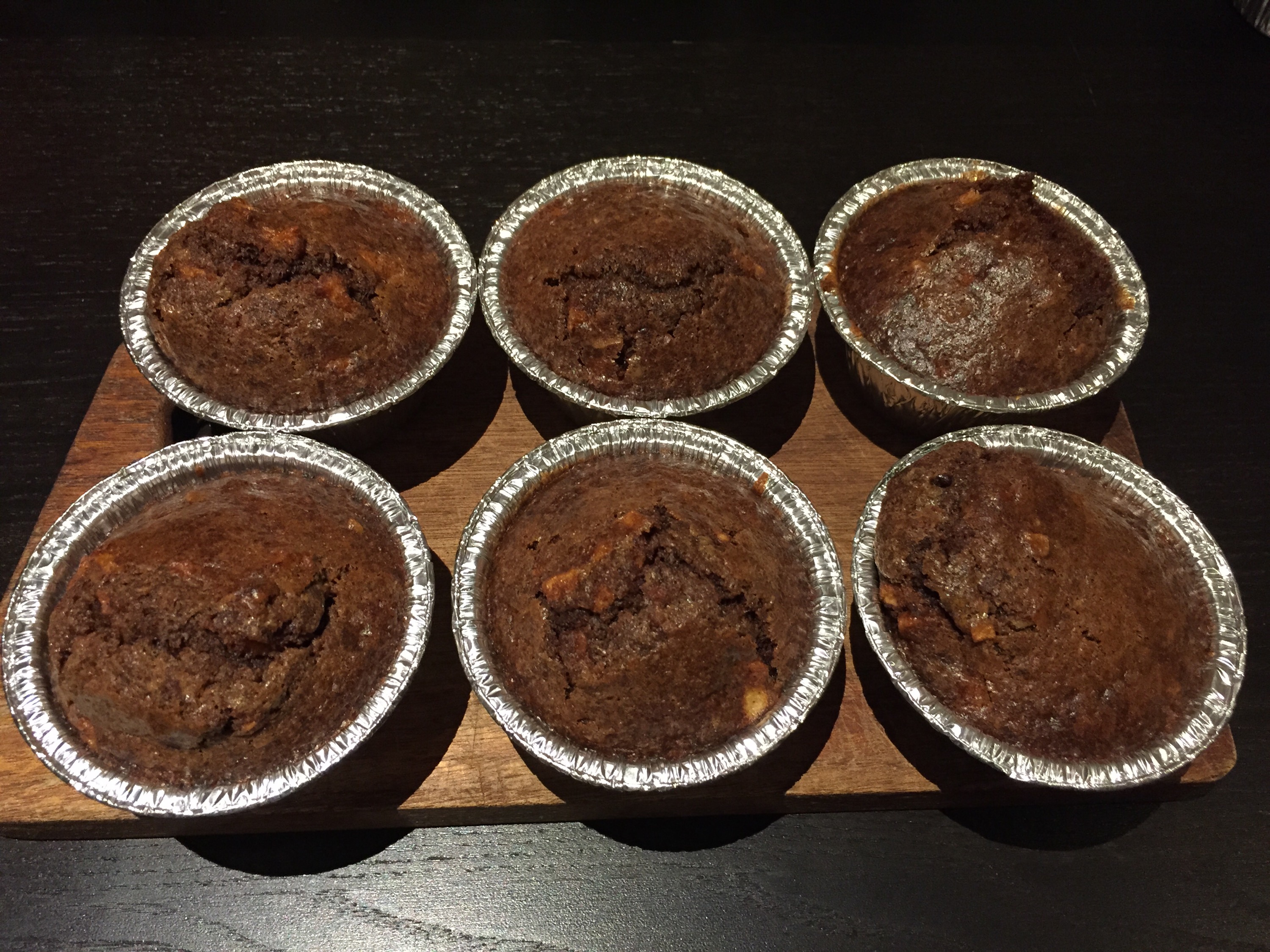 The egg-white would be hand-mixed to soft peak, then sugar would be added and mixed further to stiff-peak (meringue.) In another bowl are the melted butter, milk and the egg-yolks mixed together. When both bowls are ready, I would use a spatula to scoop up some of the meringue and gently fold it into the butter-milk-and-yolk-mix. Continue until all of the meringue are folded into the mix. Next part would be to add the powders gradually with a sieve and fold it in as well. It have to be added gradually or else all the work to add air into the mix will be done for nothing. Finally, add the last ingredients such as apples and pecan nuts and fold it all again. The added air and folding technique will make the Cake-mix more airy and gives it more of a rise in the oven. Because of the rise of cake, it is best to fill the cups half-full otherwise it might droop out of the container/cup.
