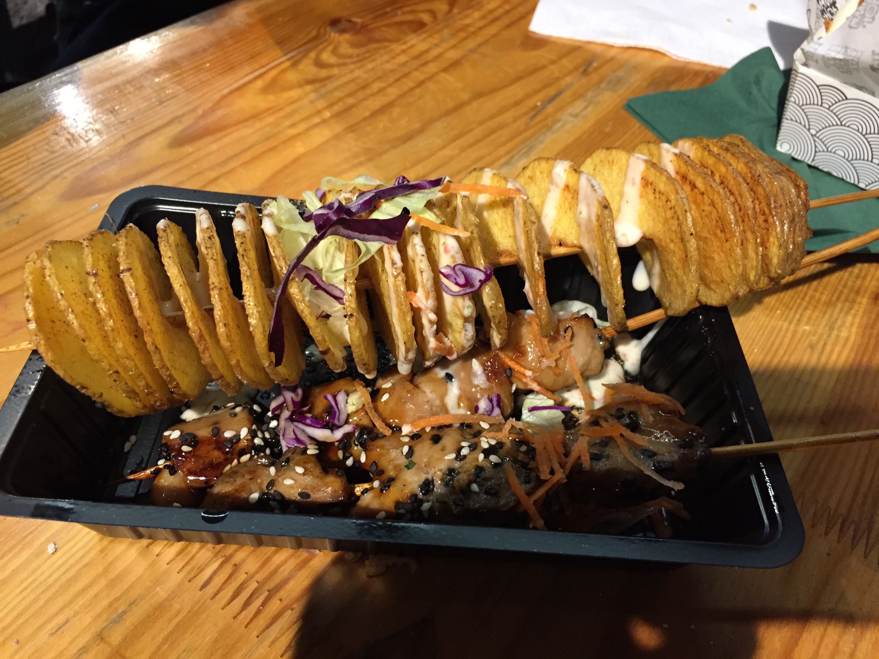 The Potato-twister and chicken skewers. A parties favorite that is looks fun, curled up and twisted on a stick. This fried potato on a stick is easily sharable with family and friends or just have it for yourself.
