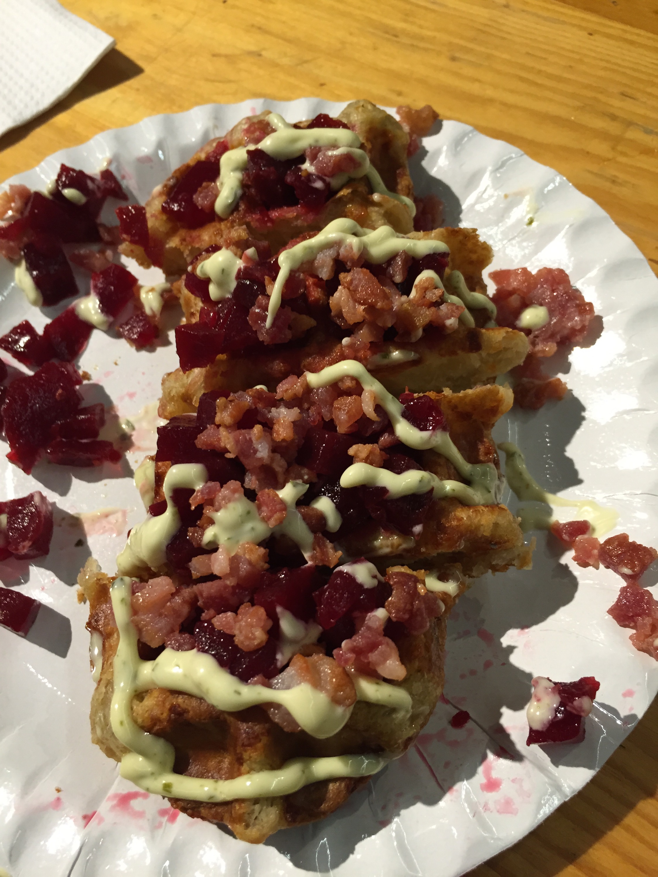 A Savoury waffle with beetroot and bacon. An odd combination, but who does not like bacon. With waffles you mostly think of sweets, but savoury dishes can also be made. Same with pancakes or crèpes, it can be sweet or savoury, definitely worth a try to make some savoury pancake or waffles.