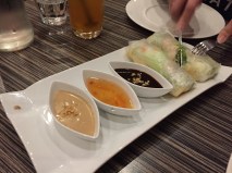 The three entree’s were a shrimp roll, fried shrimps and a beef roll. We decided to share the entree’s, to have a taste of each dish. The first dish is the shrimp roll with veggies, shrimps and vermicelli inside, on the sides are three dipping sauce, peanut sauce, sweet and sour vinegar and Hoi sin sauce. The shrimp roll definitely needed the sauce to give it a flavourful taste.